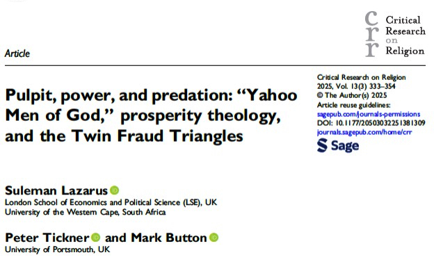 Suleman Lazarus, Peter Tickner, and Mark Button, “Pulpit, power, and predation: “Yahoo Men of God,” prosperity theology, and the Twin Fraud Triangles”